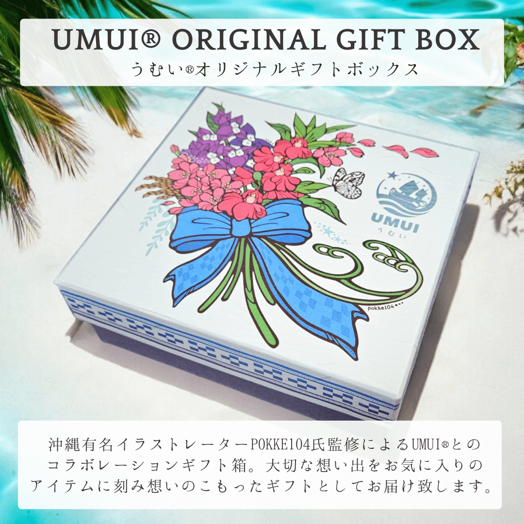 UMUIⓇの「想い出箱」は、沖縄の有名イラストレーターPOKKE104氏によりますデザインと化粧箱の監修を頂きました。
